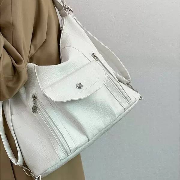 ブラックとホワイトのベーシックな2色展開で、どんなコーデにも合わせやすく、シーズンを問わず使える万能バッグです。ショルダー紐は調節可能で、斜めがけ・肩掛けの2WAYスタイルが楽しめます。軽量かつ柔らかいフェイクレザー素材で、長時間持ち歩いても負担が少ないのも魅力。