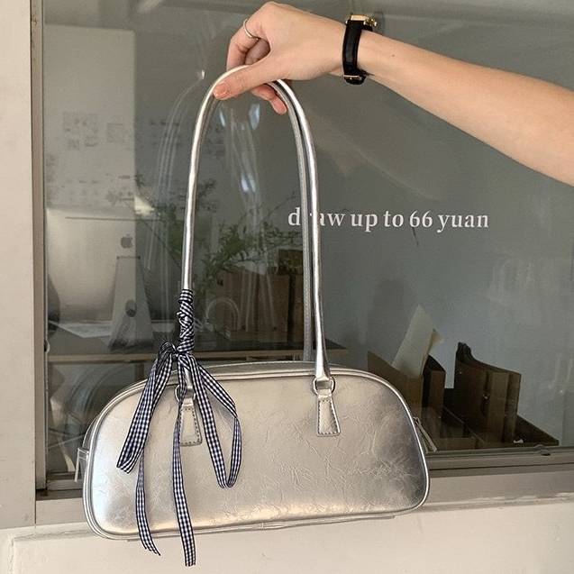 華やかな光沢感が目を引くシルバーカラーのショルダーバッグ。程よいコンパクトサイズでデイリーユースに最適ながらも、エレガントなシルエットがコーデのアクセントになります。可愛らしいチェックリボンがワンポイントになり、さりげない甘さを演出します。