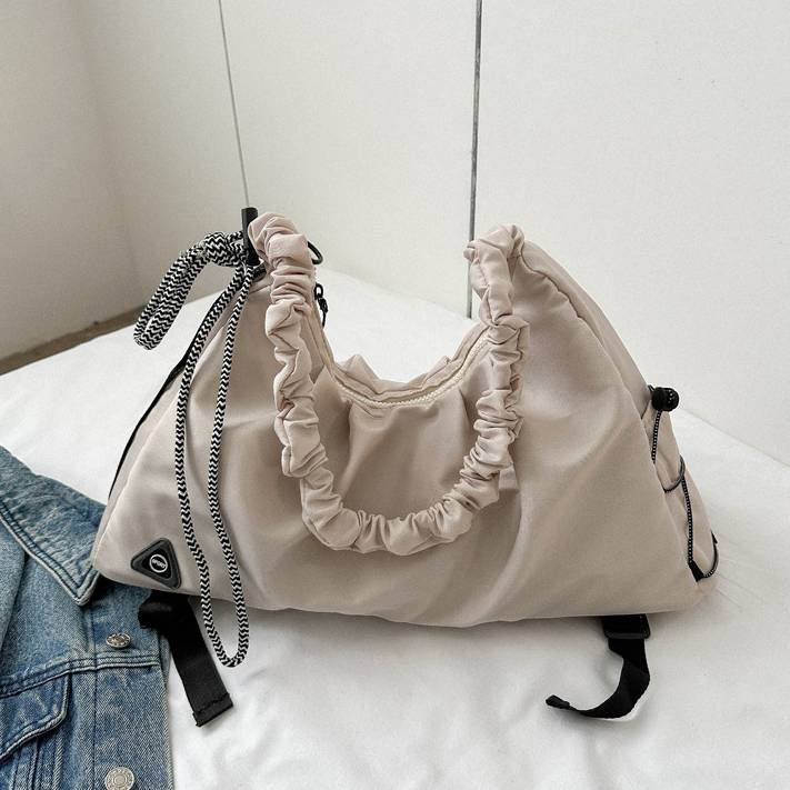 約0.3kgと超軽量ながら、見た目以上の収納力があり、財布・スマホ・コスメ・水筒など必要なものをしっかり収納可能。ドローストリング付きで開閉もスムーズ、さらにサイドポケットも便利で使い勝手抜群。フリル持ち手は肩掛けもラクで、長時間の使用でもストレスを感じさせません。