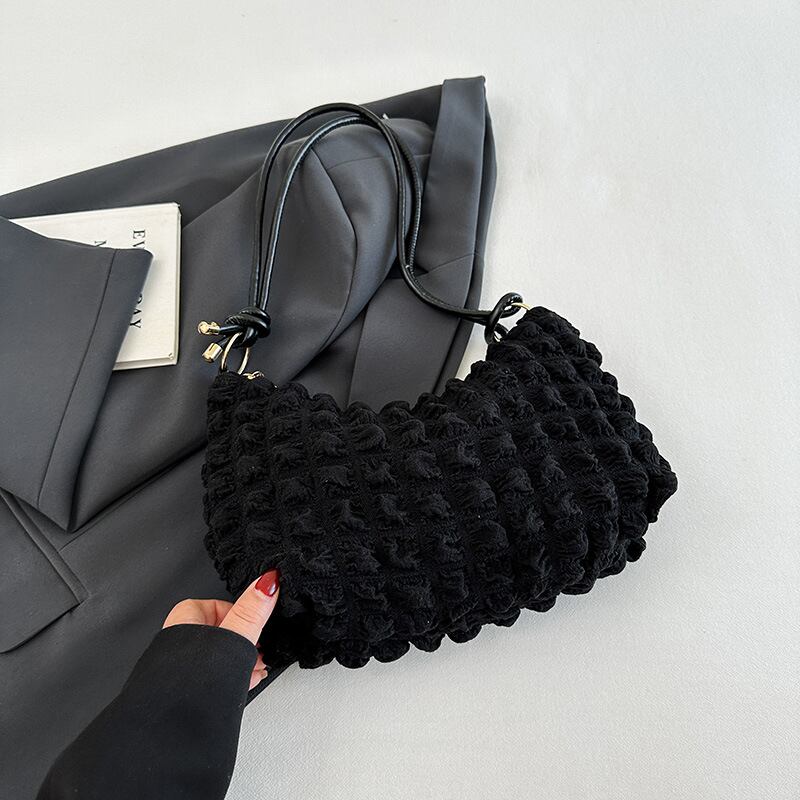 肌触り抜群のふわふわ生地が魅力のワンショルダーバッグ。表面は立体的な格子模様で、シンプルながら個性をプラス。カジュアルからフェミニンなコーデまで幅広くマッチする万能アイテムです。