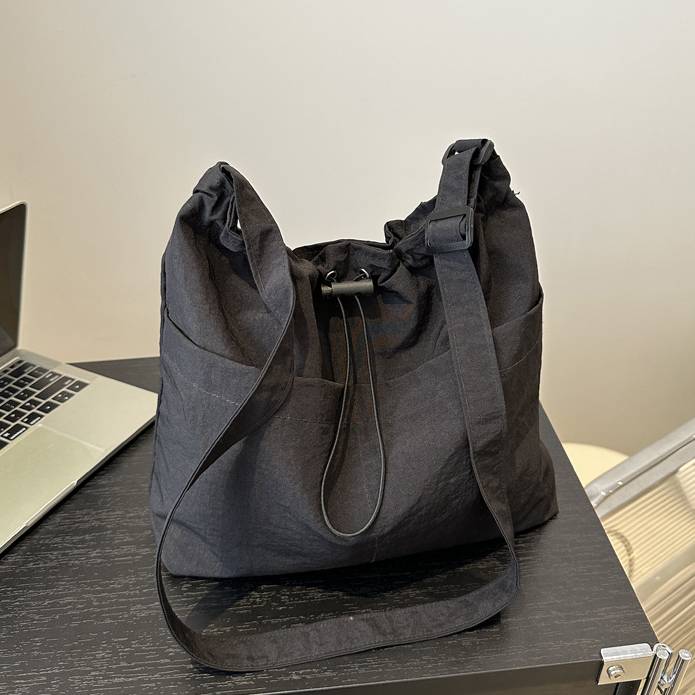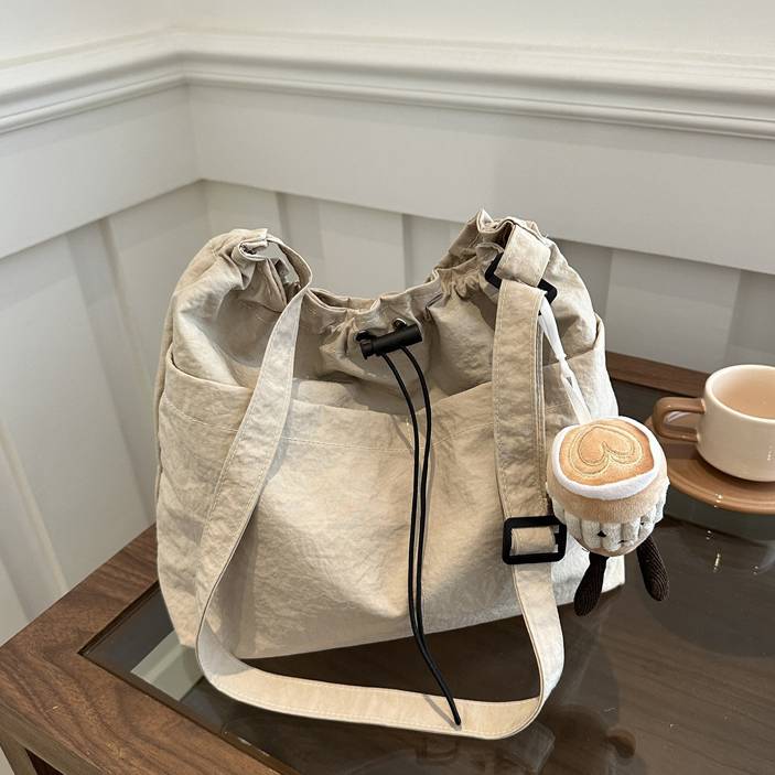 ナチュラルな風合いと程よいカジュアルさが魅力の、巾着タイプのショルダーバッグ。軽量かつ大容量設計で、デイリー使いからちょっとしたお出かけまで幅広く活躍します。シンプルなデザインながら、外ポケットや調整可能なショルダーストラップが機能性も抜群。