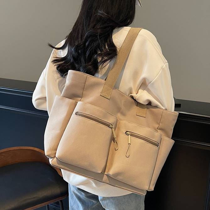 シンプルで実用性抜群のキャンバストートバッグが登場。洗練されたデザインに加え、前面にはジッパーポケットが2つ、サイドにはドリンクや小物がすぐに取り出せるポケット付き。A4ファイルやノートパソコン、タンブラー、コスメなどをしっかり収納できる大容量設計で、通学・通勤・マザーズバッグとしても大活躍します。