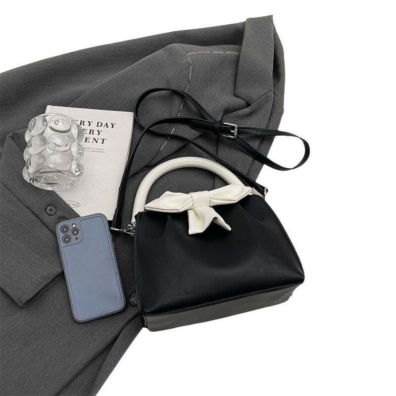 手持ち・肩掛けの2WAY仕様で、付属のストラップでショルダーバッグとしても使える優れもの。普段のお出かけから、デート、女子会、ちょっとしたパーティーまで幅広く活躍します。リボンと持ち手部分がホワイトで統一され、ブラックベースとのコントラストが美しく、視線を引きつけるアクセントに。