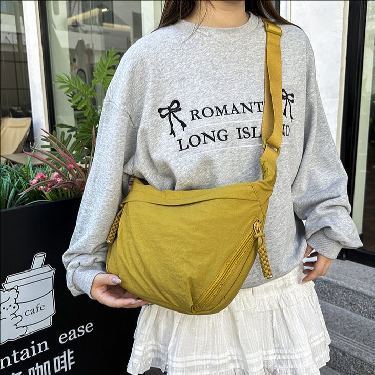 軽くて使いやすい、ナイロン風素材のカジュアルショルダーバッグが登場。普段使いはもちろん、旅行やお出かけにもぴったりな大容量サイズで、見た目以上に荷物がたっぷり入る設計です。シンプルな無地デザインだから、どんなコーデにも合わせやすく、ユニセックスでの使用も可能。