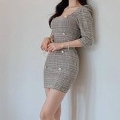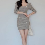ツイード ワンピース タイト ミニワンピース レディース 長袖 五分袖 スクエアネック 韓国風 きれいめ 上品 パールボタン セクシー エレガント お呼ばれ デート 二次会 結婚式 通勤 通学 春 夏 秋 冬 20代 30代 40代 大人可愛い フェミニン おしゃれ 人気 トレンド 体型カバー グレー C-OSS0135