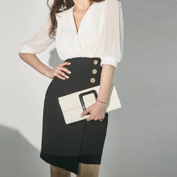 シフォンのような軽やかなホワイトトップスと、引き締まったブラックスカートの組み合わせが大人の女性らしさを演出します。