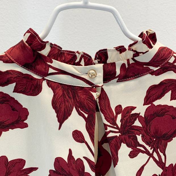 ブラウスのリボンを結んで可愛らしさをプラス。落ち着いた赤が大人の魅力を演出します。