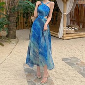 ブルー ホワイト ワンピース レディース マキシ丈 ロングドレス フレアワンピース クロスストラップ バックオープン リゾートドレス きれいめ エレガント 夏ワンピ 海外風 韓国ファッション リゾート お呼ばれ デート 旅行 ビーチ 高見え 大人可愛い トレンド 人気 上品 着痩せ シフォン素材 C-OSS0148