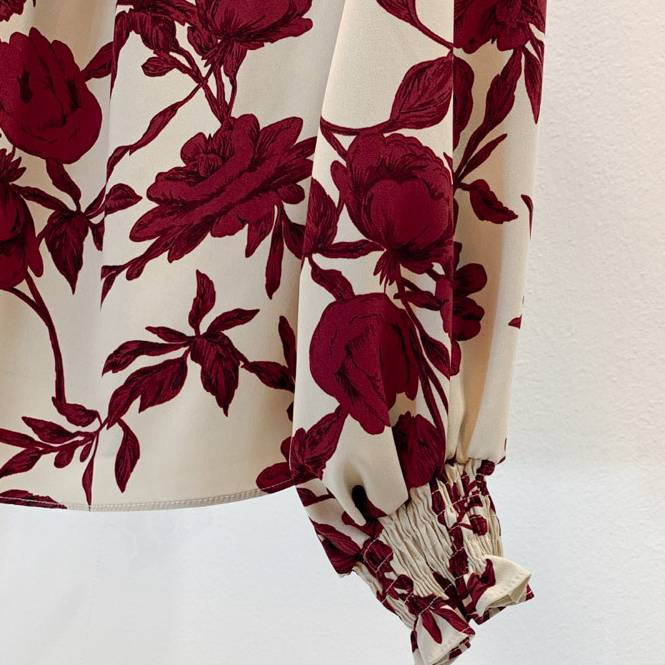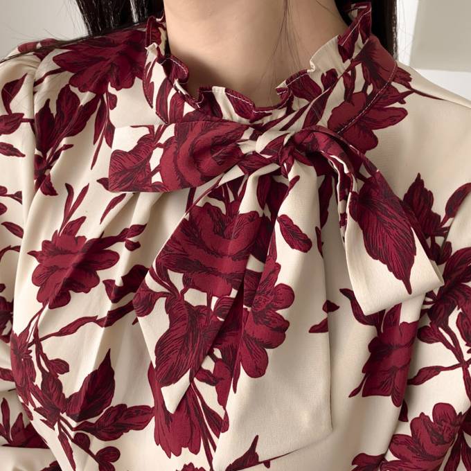 ブラウスのリボンを結んで可愛らしさをプラス。落ち着いた赤が大人の魅力を演出します。