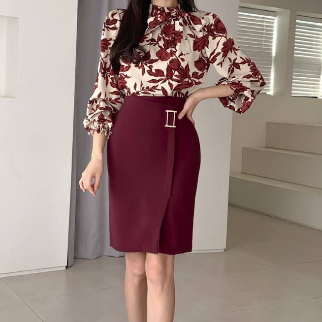 レッド セットアップ レディース 花柄ブラウス タイトスカート 上下セット ハイウエスト 通勤 OL オフィス お呼ばれ デート きれいめ 上品 フォーマル 韓国風 春 夏 秋 冬 20代 30代 40代 高見え エレガント 大人フェミニン トレンド 人気 着痩せ 美ライン セットコーデ スリットスカート リボンタイ C-OSS0147
