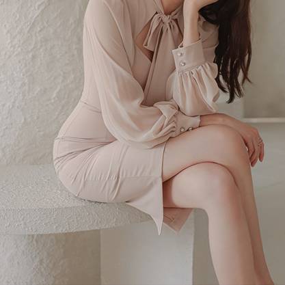 ふんわりシフォン袖とリボンネックが上品で女性らしい印象を与えるタイトミニワンピース。