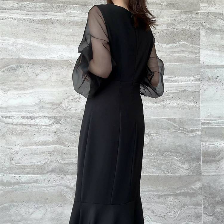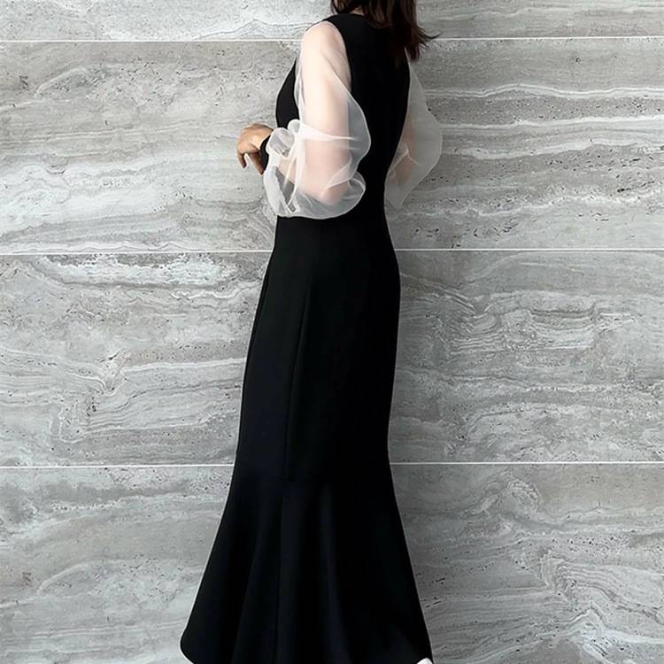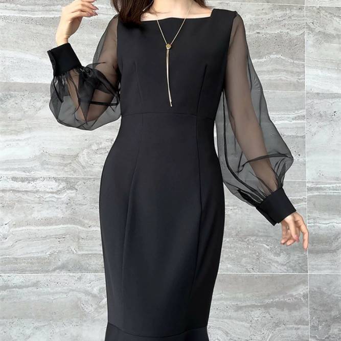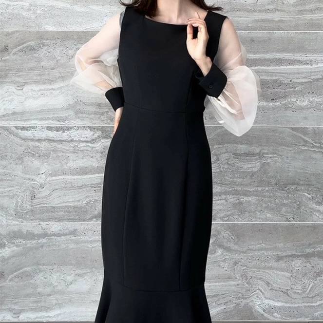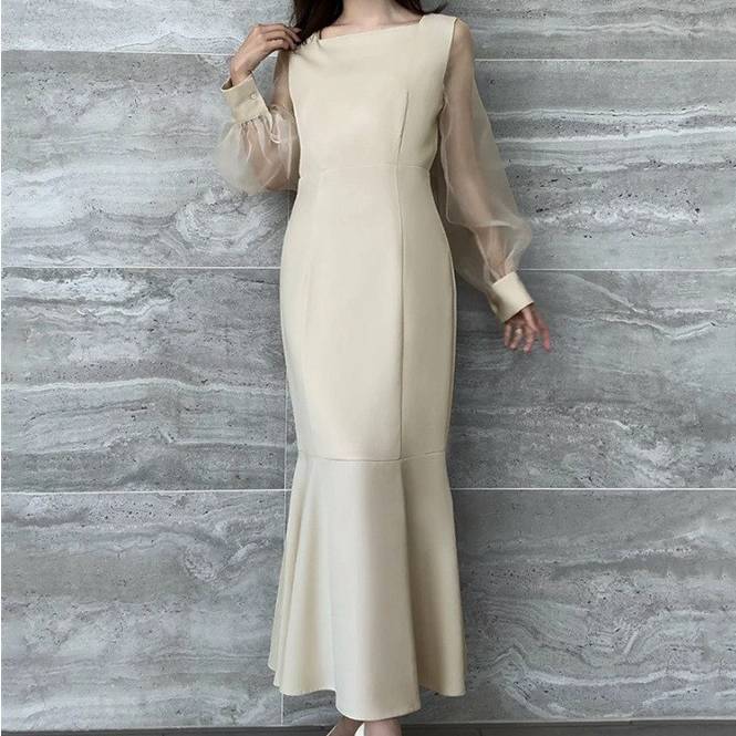 レディース ワンピース 長袖 マーメイドライン シアースリーブ 透け感 袖あり フォーマル ドレス ブラック ホワイト ベージュ エレガント きれいめ 韓国ファッション パーティードレス 二次会 結婚式 同窓会 発表会 通勤 オフィス 春 秋 冬 大人女子 上品 着痩せ 効果 体型カバー M L XL C-OSS0174