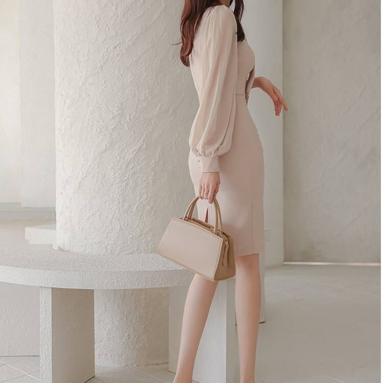 タイトワンピース レディース 長袖 リボンネック シフォン袖 フォーマル ワンピース ベージュ 韓国ファッション きれいめ エレガント 通勤 オフィス デート 二次会 同窓会 パーティー 結婚式 お呼ばれ 上品 大人女子 体型カバー 春 秋 冬 ミニワンピ 着痩せ効果 美シルエット S M L XL C-OSS0175