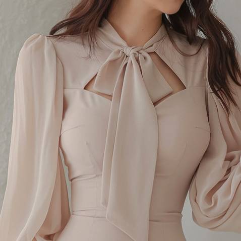 ボディラインにフィットするシルエットで、スタイルアップ効果抜群。首元のリボンと胸元のカットデザインが抜け感を演出し、フェミニンさとエレガンスを両立。
