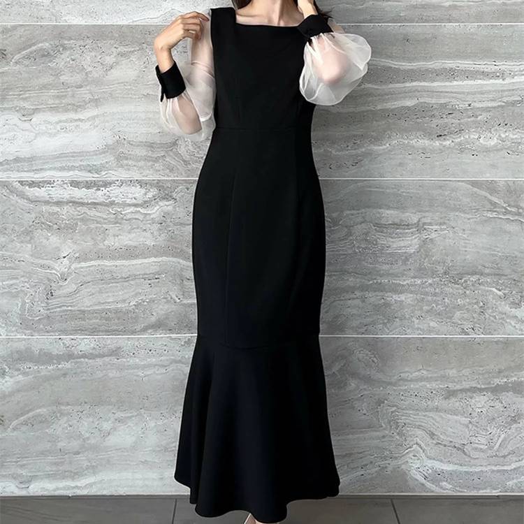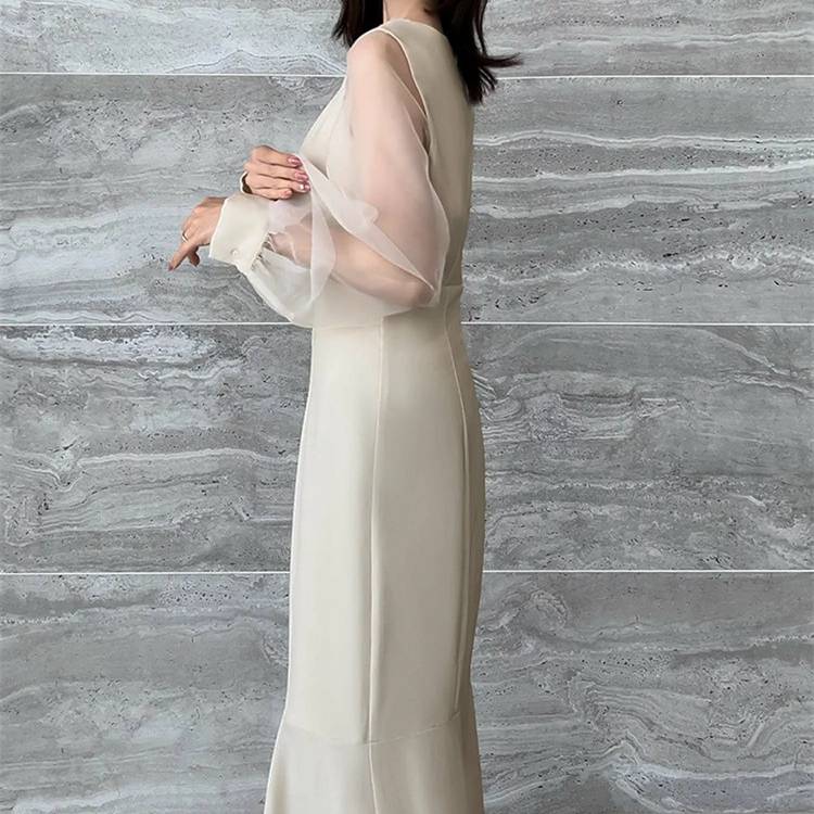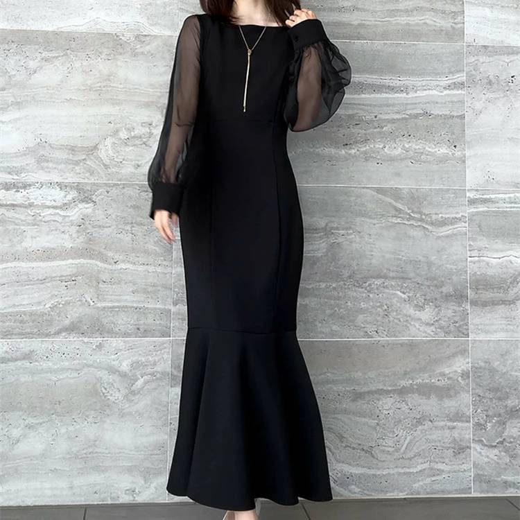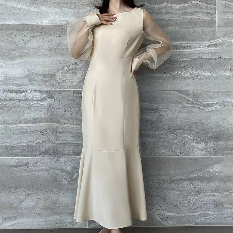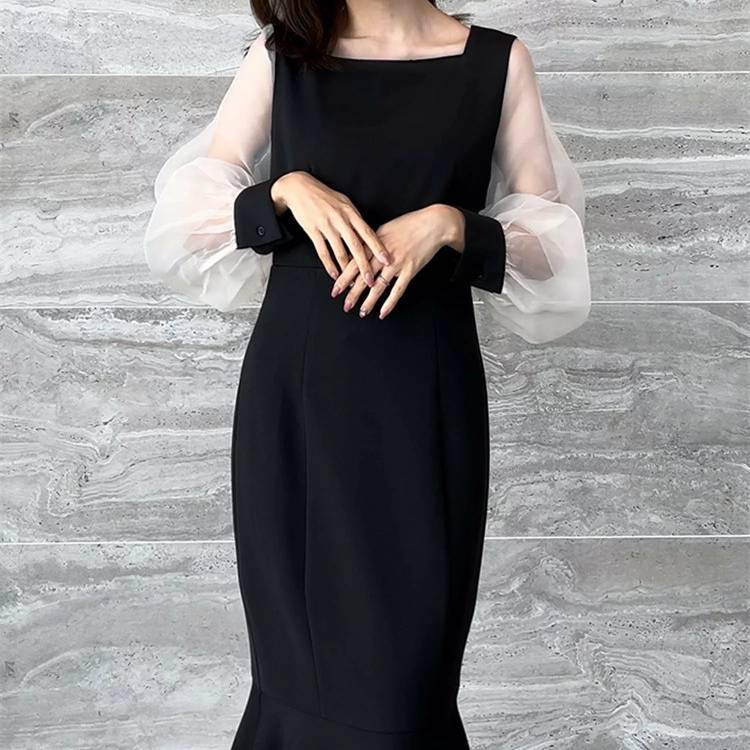 レディース ワンピース 長袖 マーメイドライン シアースリーブ 透け感 袖あり フォーマル ドレス ブラック ホワイト ベージュ エレガント きれいめ 韓国ファッション パーティードレス 二次会 結婚式 同窓会 発表会 通勤 オフィス 春 秋 冬 大人女子 上品 着痩せ 効果 体型カバー M L XL C-OSS0174