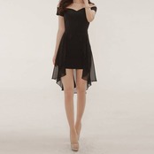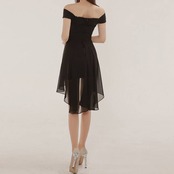 オフショルダーの綺麗なデコルテラインと、ふんわり広がるシフォンのアシンメトリーヘムが魅力のタイトミニドレス。前はミニ丈、後ろはロングシフォンの異素材デザインで、歩くたびに軽やかに揺れて女性らしさを存分に引き立てます。