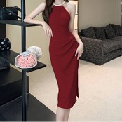 ブラック レッド ピンク ホワイト ワンピース レディース ミディ丈ワンピース ノースリーブ ドレス タイトドレス ハイネック パールネック エレガント 上品 セクシー 大人きれい 体型カバー 美シルエット 結婚式 二次会 パーティー デート 韓国ファッション 人気 トレンド 春 夏 秋 冬 C-OSS0211