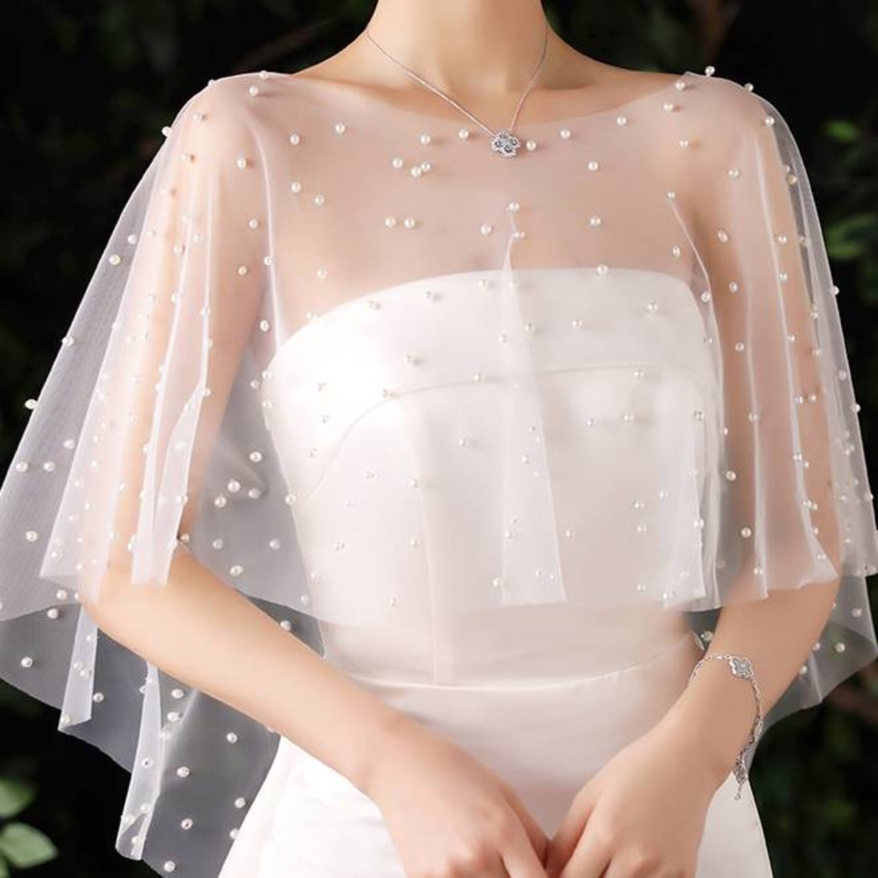 ウェディング ショール パール付き チュールケープ 花嫁 ボレロ ホワイト ケープ 羽織 結婚式 披露宴 二次会 前撮り ブライダル ドレス用 アクセサリー レディース シースルー 上品 可愛い エレガント ロマンチック ウエディング小物 フォーマル お呼ばれ 成人式 卒業式 C-OSS0181