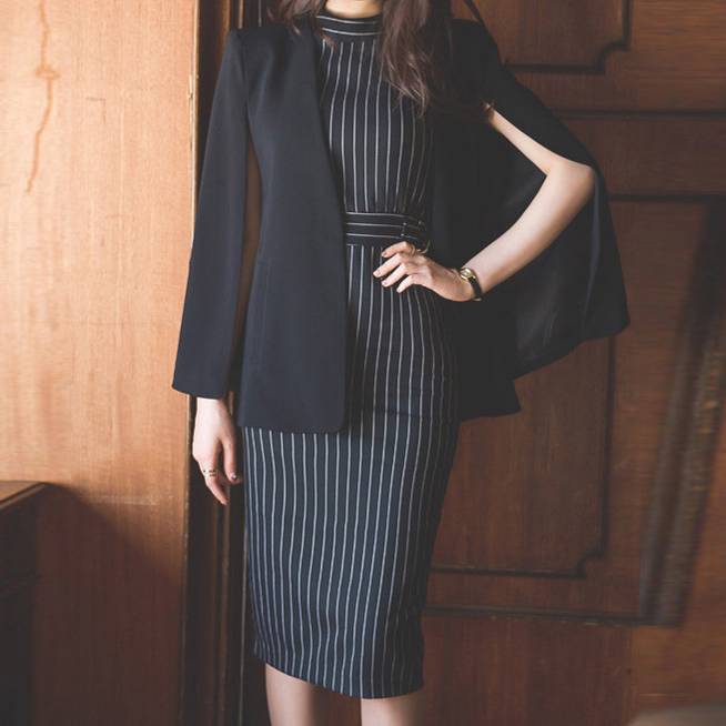 クラシカルな印象を放つケープジャケット風のタイトワンピース。