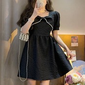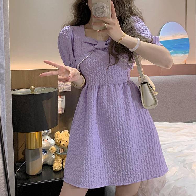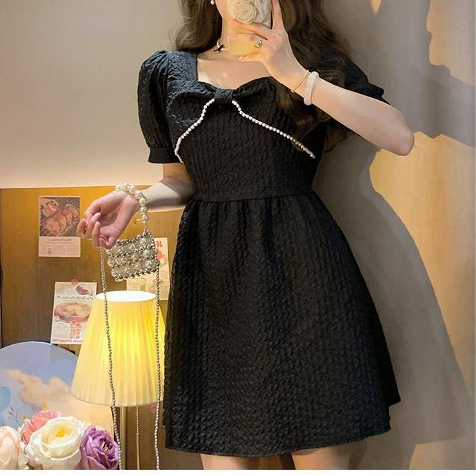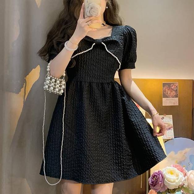 ブラック パープル ホワイト ワンピース レディース ミニ丈 パフスリーブ パール リボンデザイン Aライン フェミニン ガーリー 韓国ファッション 春 夏 秋 デート 通学 カフェ お呼ばれ 清楚 ガーリーコーデ 可愛い きれいめ 人気 トレンド 高見え シンプル エレガント C-OSS0203
