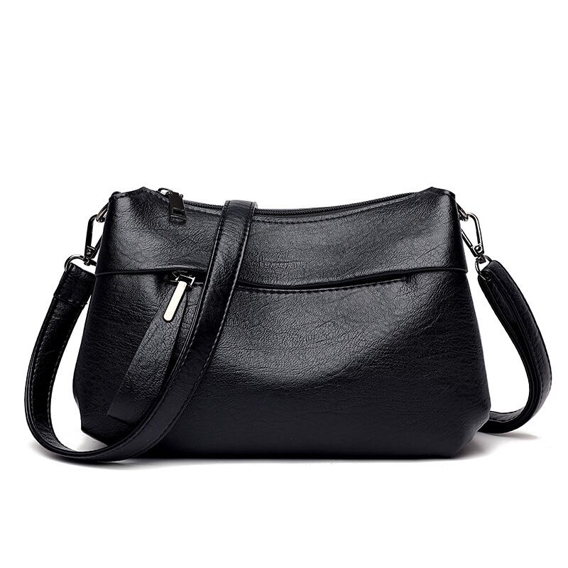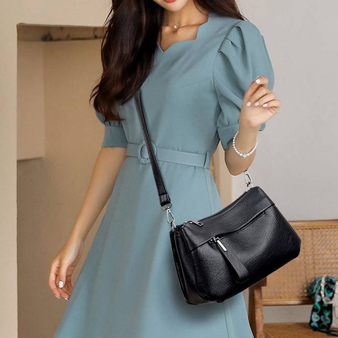 シンプルなデザインながら上品さと機能性を兼ね備えたレザー調ショルダーバッグ。