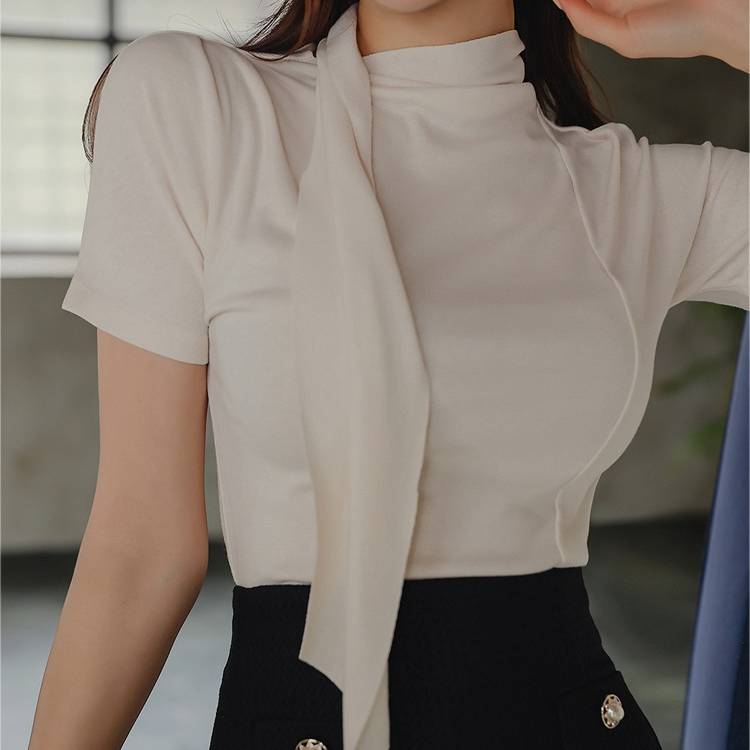 ・リボンタイ付きトップスでフェミニンな印象