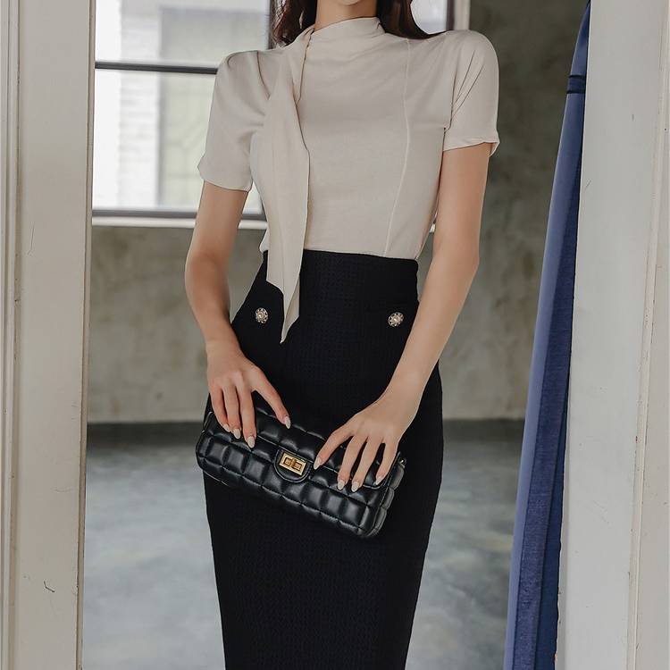 スカートのタイトラインが美しく、シンプルながら女性らしさを際立たせます。