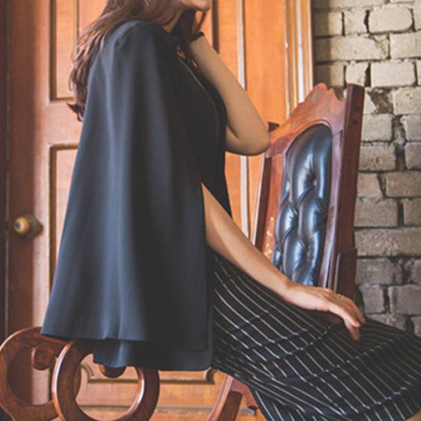 肩から流れるケープデザインがエレガントさを引き立て、フォーマルシーンやビジネスシーンにも対応。