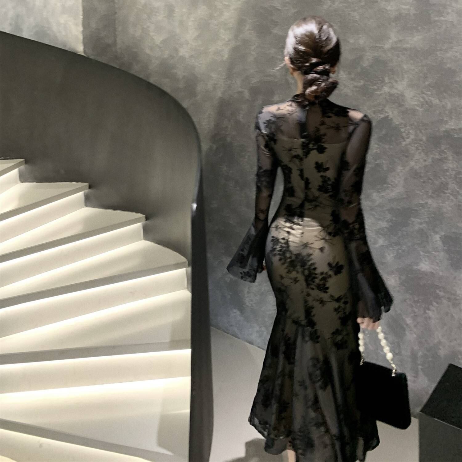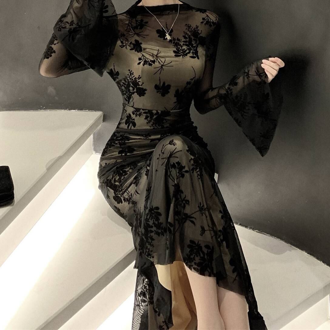 エレガントレース シアーワンピース ロングドレス 透け感 レディース ワンピース タイトドレス マーメイドライン 長袖 ドレス セクシー 上品 韓国ファッション デート お呼ばれ 二次会 パーティー 秋冬 春夏 ブラック 1色展開 C-OSS0252