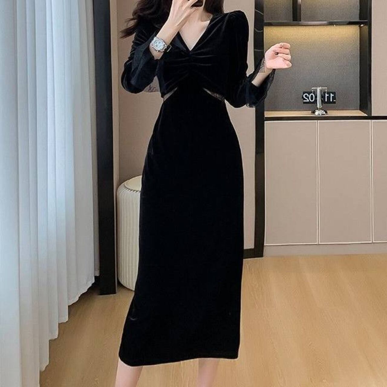 エレガント ベルベット ロングワンピース Vネック タイトシルエット ワンピース ドレス パーティー 秋冬 春 夏 体型カバー 上品 大人フェミニン ブラック レディース ロング丈 美ライン C-OSS0235