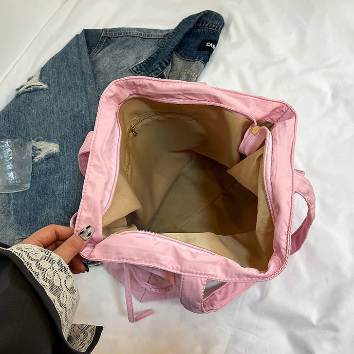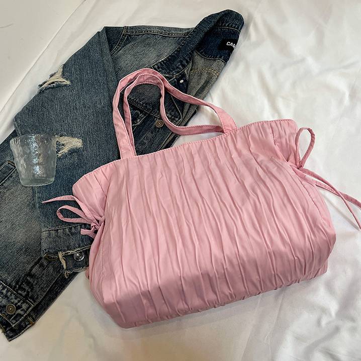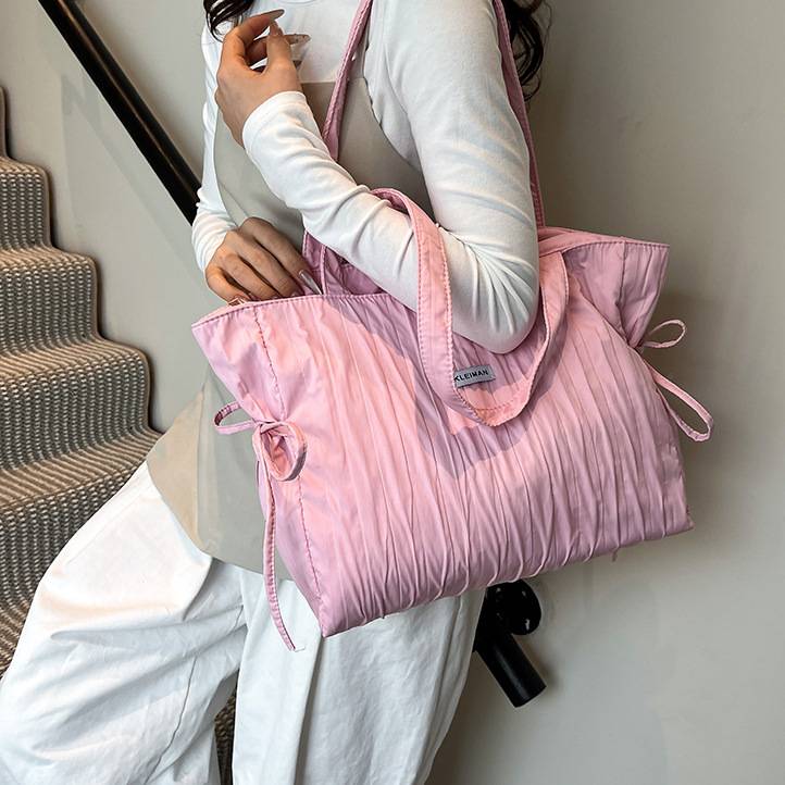 サイドのリボンデザインがさりげないアクセントになり、シンプルながらも女性らしさをプラス。ブラック・ピンク・オフホワイト・ホワイトの使いやすいカラー展開で、季節を問わず長く愛用できる万能トートバッグです。
