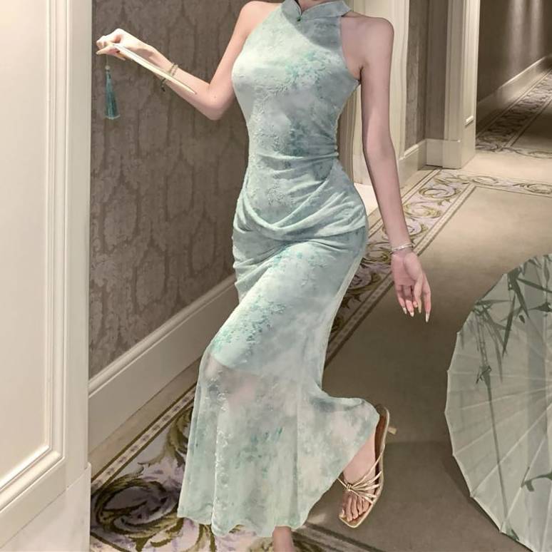 上品な透け感と、身体のラインを美しく引き立てるチャイナ風ホルターネックデザインのロングドレスです。淡いライトブルーカラーが清涼感と女性らしさを演出し、特別なシーンでも印象的なスタイルを完成させます。