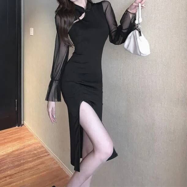 スリットワンピース シースルー袖 タイトワンピース ブラック ドレス 大人可愛い セクシー 上品 エレガント パーティー ワンピ 結婚式 二次会 デート お呼ばれ 韓国風 トレンド レディース 体型カバー 美脚 美シルエット 5サイズ展開 C-OSS0240