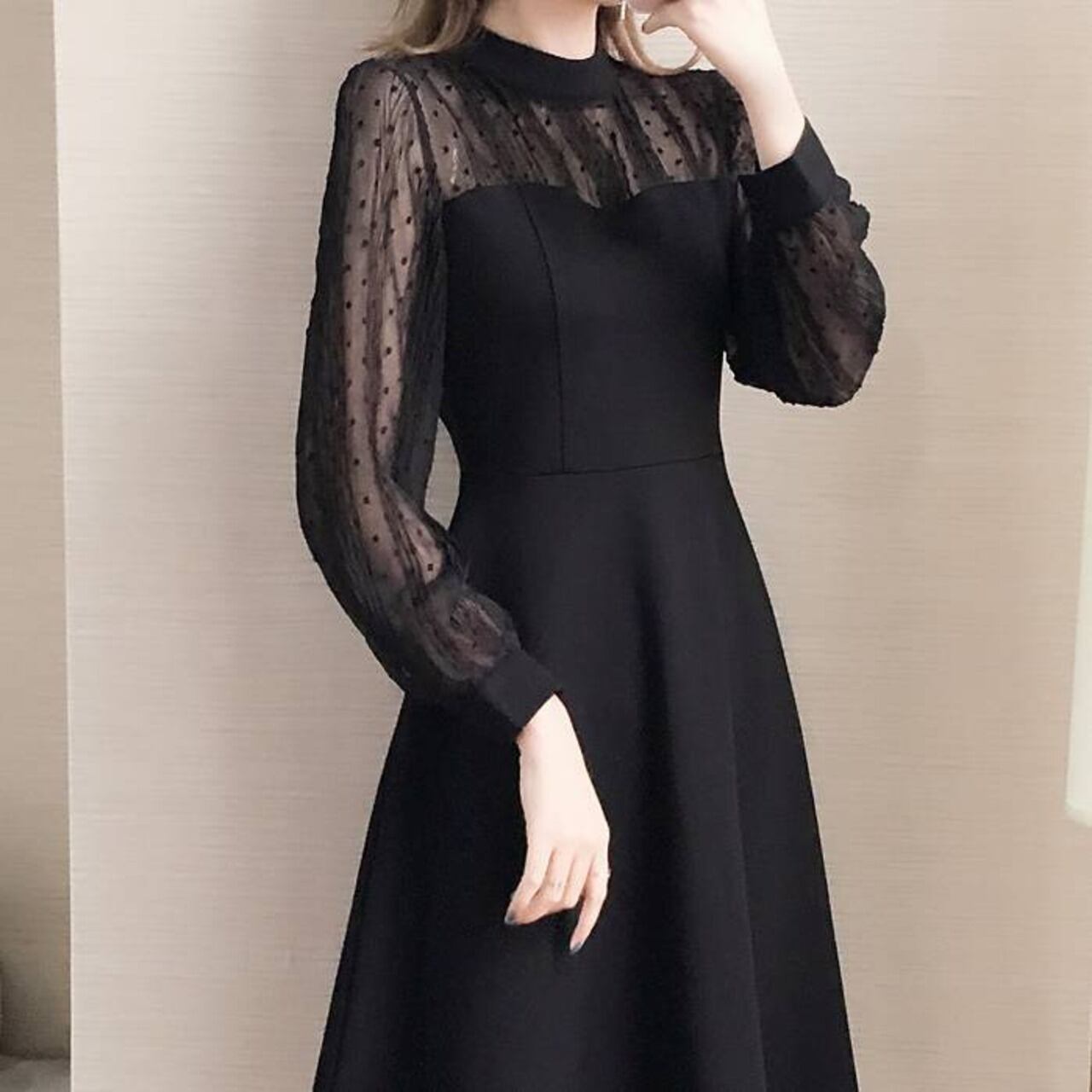 エレガント ドットチュール 切り替え ワンピース フレアワンピース 長袖 シースルー袖 きれいめ ブラック 上品 可愛い 大人女子 デート 通勤 お呼ばれ 体型カバー レディース ワンピース 春夏 秋冬 コーデ 人気 おしゃれ C-OSS0237