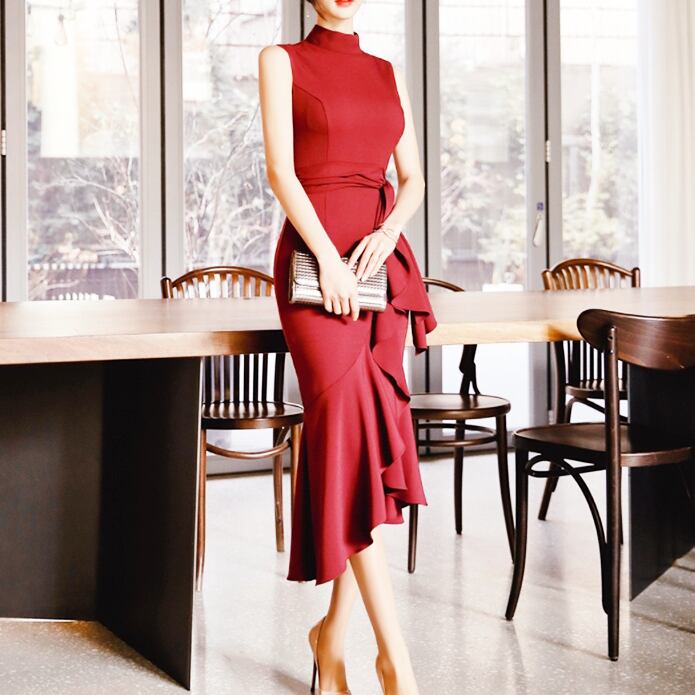 商品名:ハイネック ノースリーブ ラッフルフリル マーメイドワンピースドレス