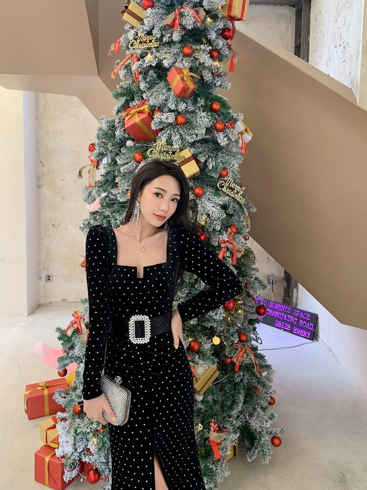 商品名:ドット柄パフスリーブ&スクエアネック ロングワンピース