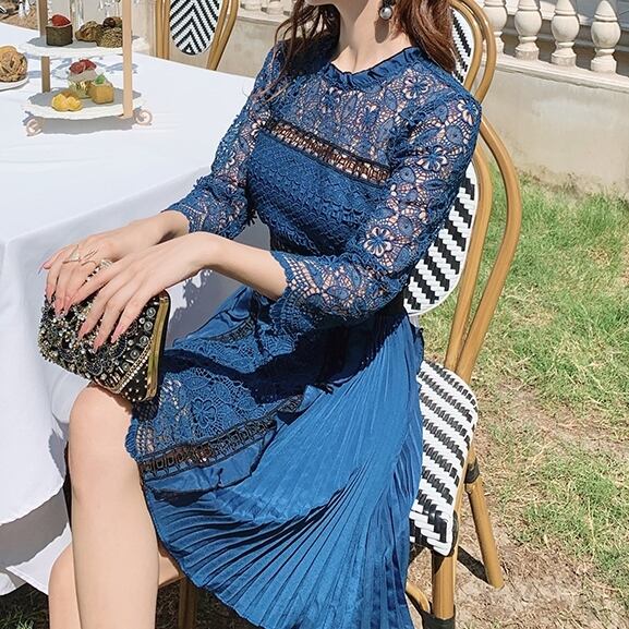 商品名:レース7分袖 プリーツ Aラインドレスワンピース