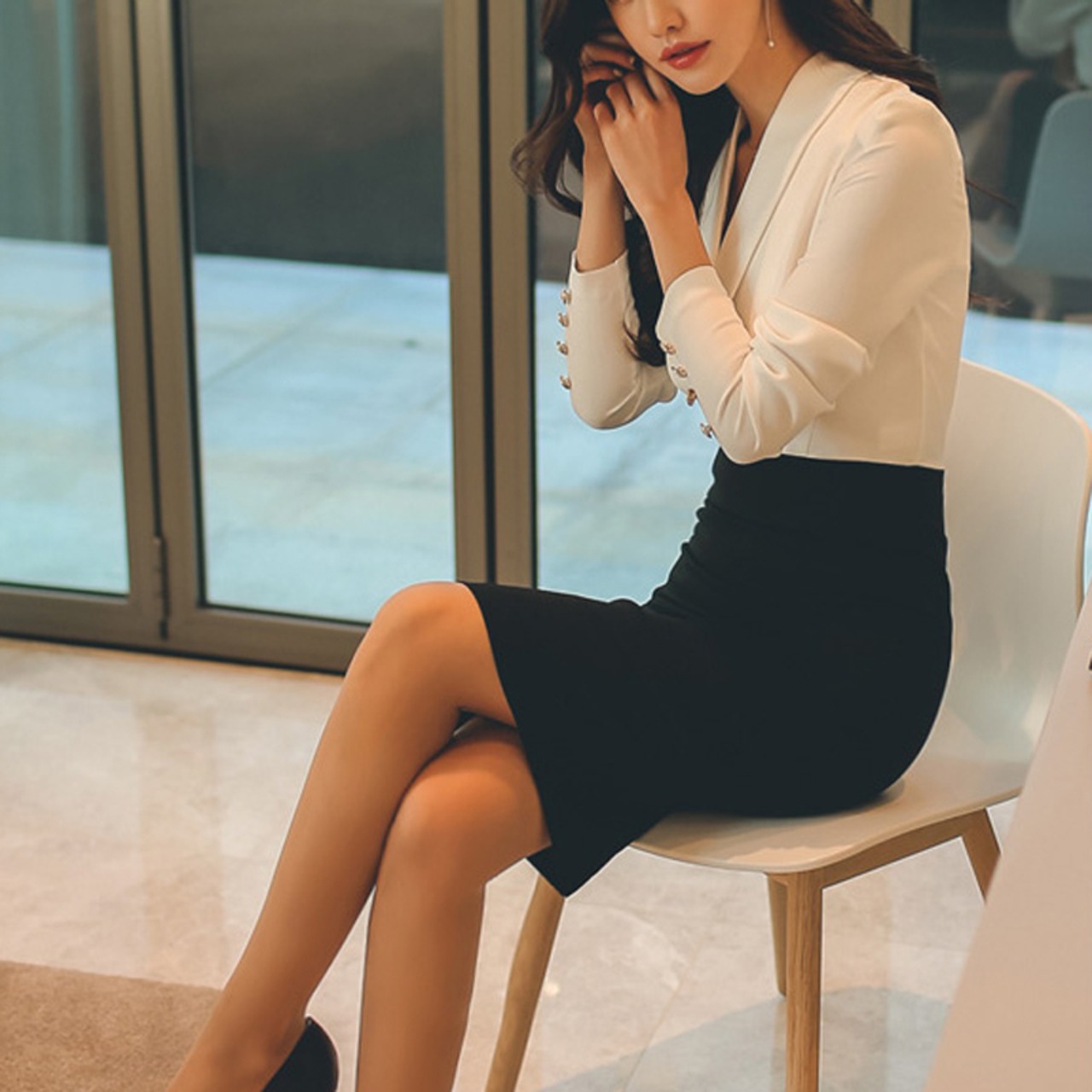 ブラウスとミディアム丈のタイトスカートを