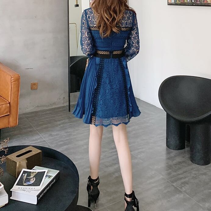 商品名:レース7分袖 プリーツ Aラインドレスワンピース