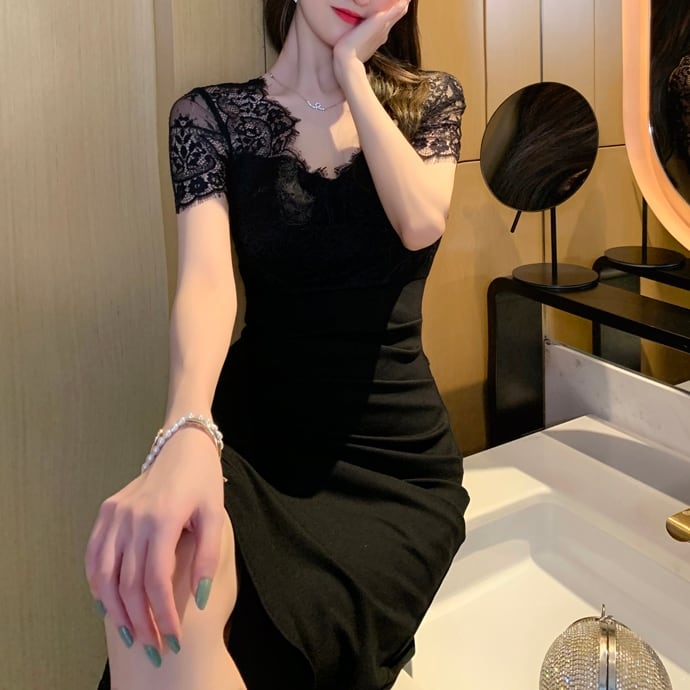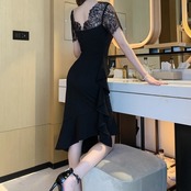 商品名:シースルー レース アシンメトリー タイト パーティードレス