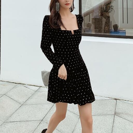 ドット柄パフスリーブ&スクエアネック ワンピース C-OAW1036