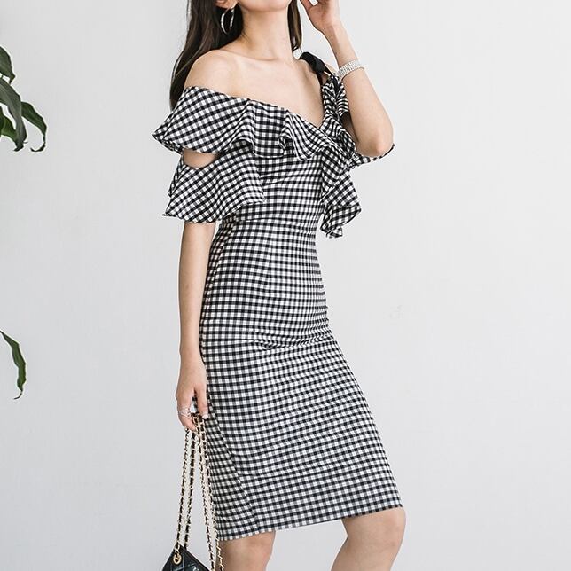 オフショルダー ギンガムチェック タイトワンピース C-OSS0005
