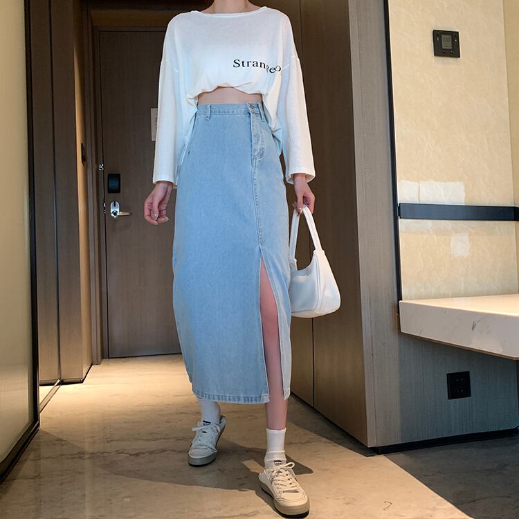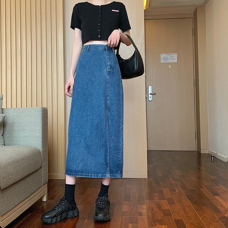 Aラインのスリット入りミモレ丈デニムスカート。