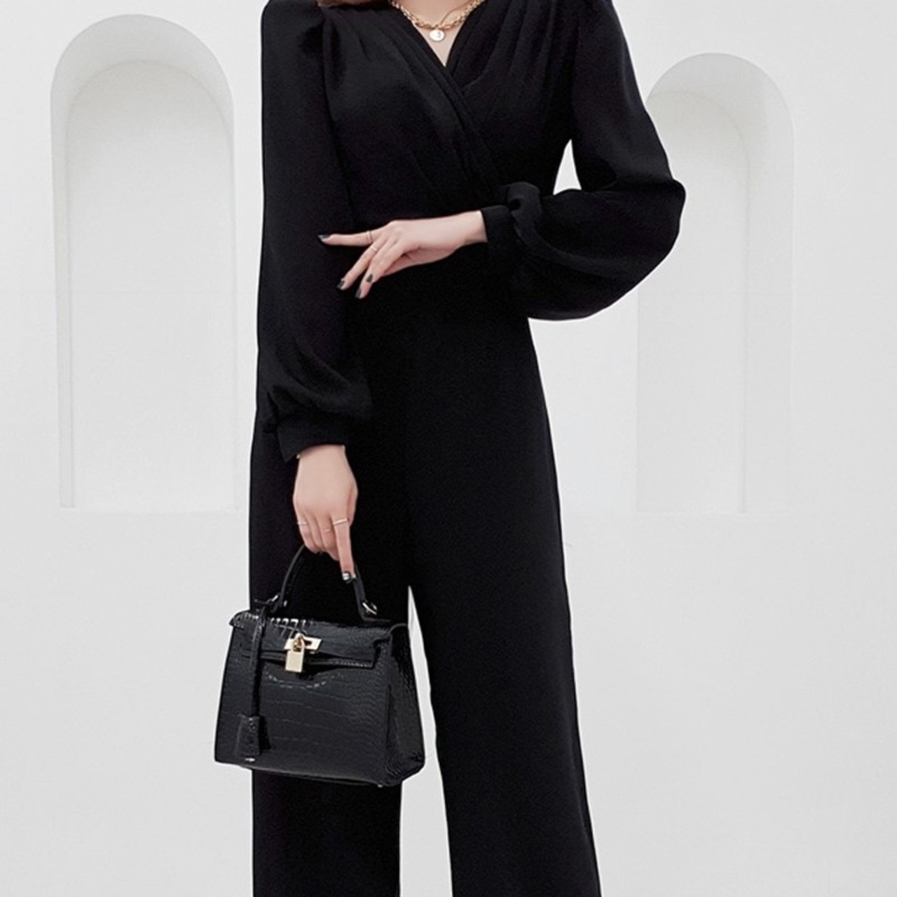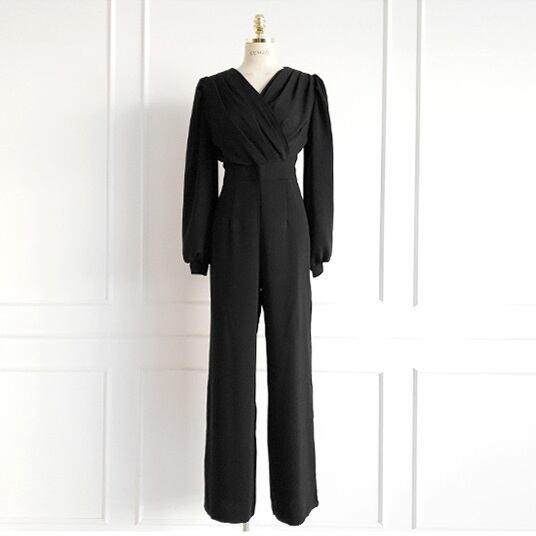 商品名:ロング丈 パフスリーブ カシュクール オールインワン パンツドレス