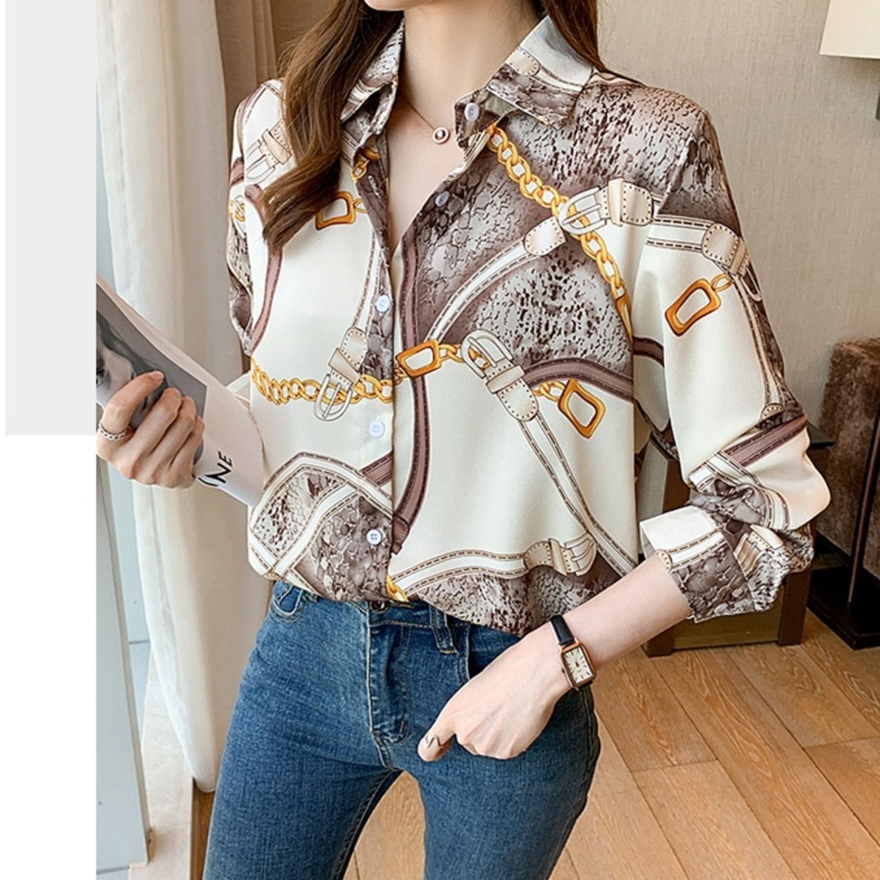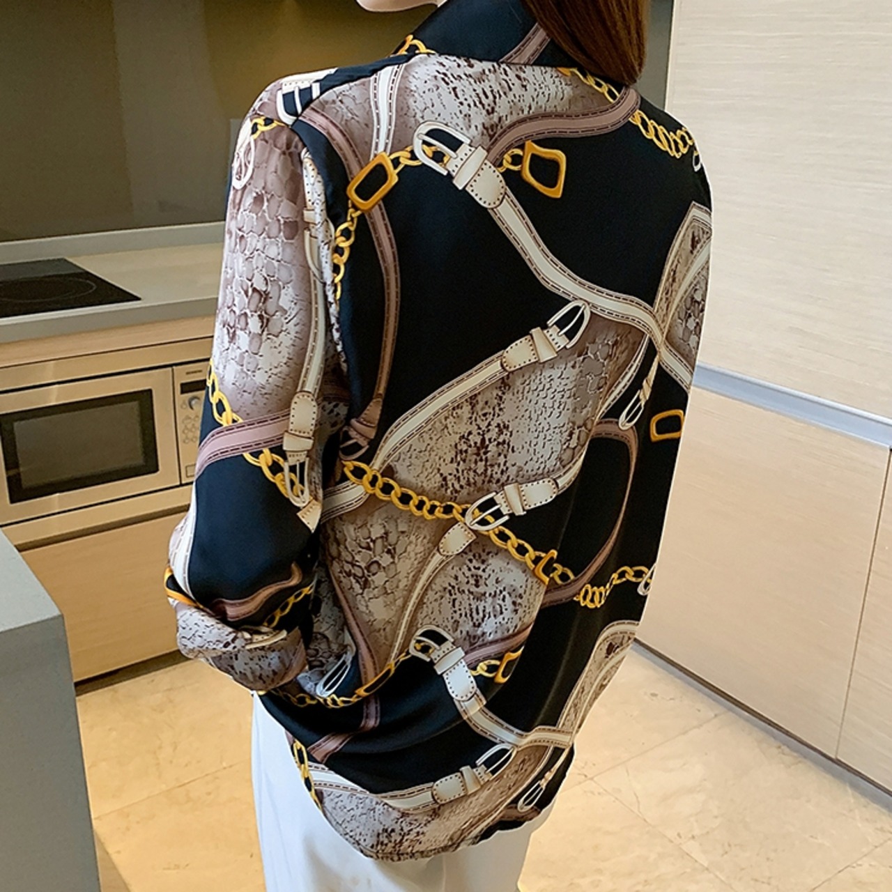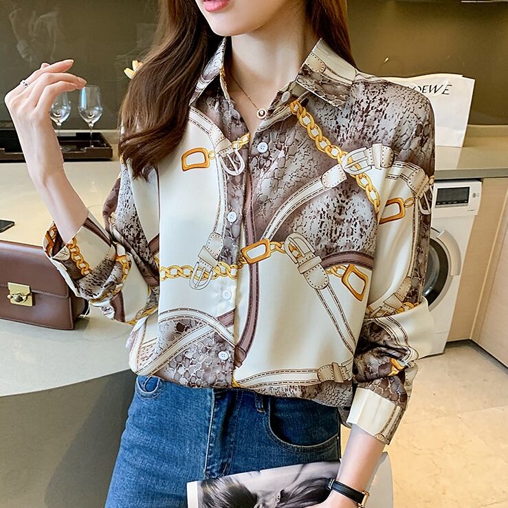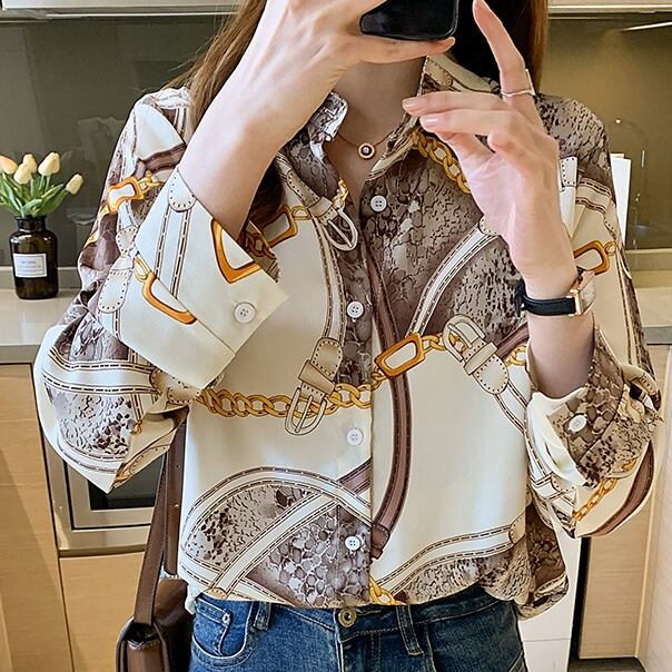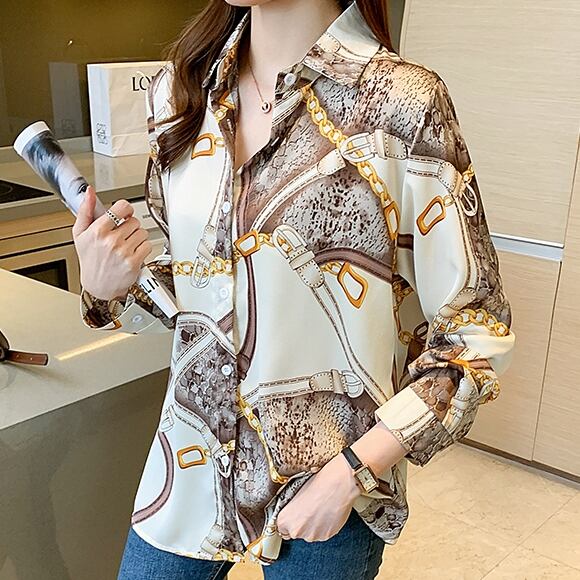 商品名:チェーンデザイン サテン 長袖 ブラウス シャツ