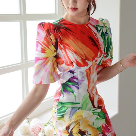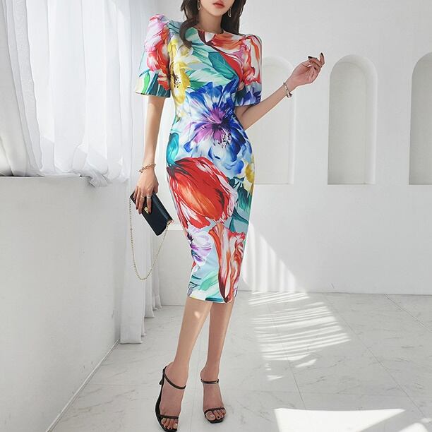 商品名:花柄 パフスリーブ タイトワンピース ドレス